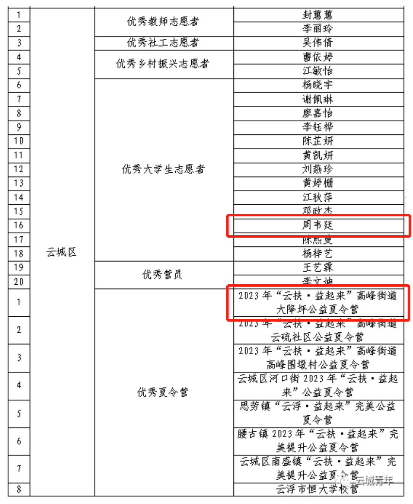 日前,由共青团云浮市委员等单位评选的2023年“云扶·益起来”公益夏令营优秀集体和优秀个人评审结果揭晓,我校应用外语学院学生党支部在云浮市云城区高峰街道开展的大降坪公益夏令营,获评云浮市“优秀夏令营”荣誉称号,应用外语学院学生党员周韦廷获评云浮市“优秀大学生志愿者”荣誉称号。