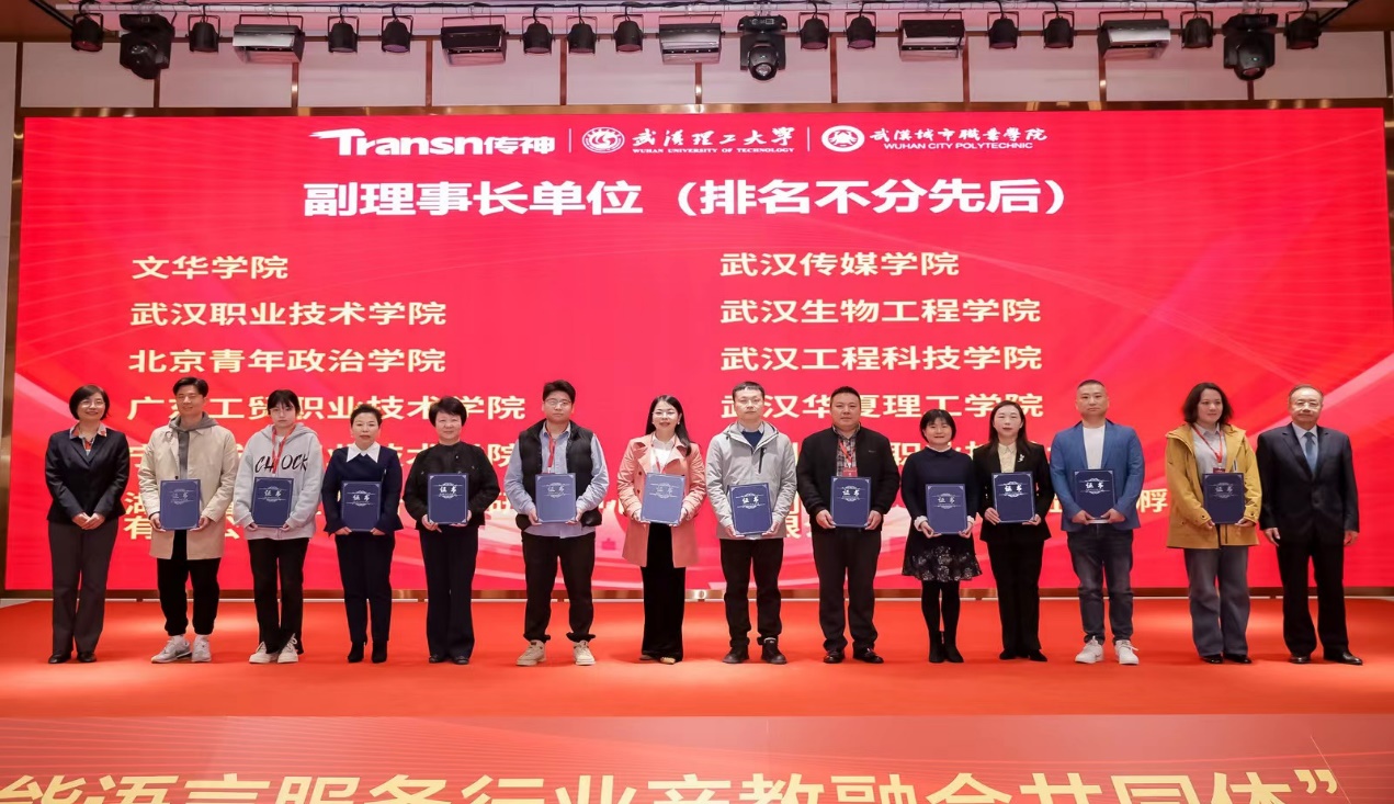 出席和莅临现场的领导和嘉宾主要有中国外文局翻译院副院长、中国翻译协会翻译技术委员会副主任委员王飞,湖北省商务厅服务贸易处副处长葛怀,武汉市教育局一级调研员李万平,武汉市商务局服务贸易处副处长彭皓园;还有共同体牵头单位的武汉理工大学党委副书记、纪委书记夏江敬,武汉城市职业学院党委副书记、校长张英,传神语联网网络科技股份有限公司创始人兼董事长何恩培。以及来自智能语言服务行业的企业、高校、科研机构等单位的二百余位代表共济一堂,现场气氛热烈。在与会成员的共同见证下,大会表决通过了《全国智能语言服务行业产教融合共同体章程》,确立了共同体组织机构名单,举行了第一届理事单位、常务副理事单位、副理事单位的授牌仪式和共同体启动仪式。