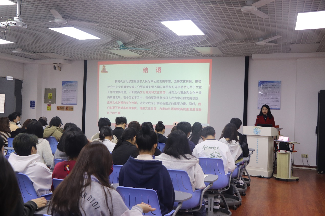 最后,彭枚芳表示作为当今时代之青年,要深入学习和贯彻习近平总书记关于文化工作的重要论述,不断提高文化自觉和文化自信,推动文化事业和文化产业高质量发展,同时希望同学们推动文化创新和文化传播,不断提高自身素质,增强文化自信,为推动外语学院高质量发展贡献自己的青春力量。