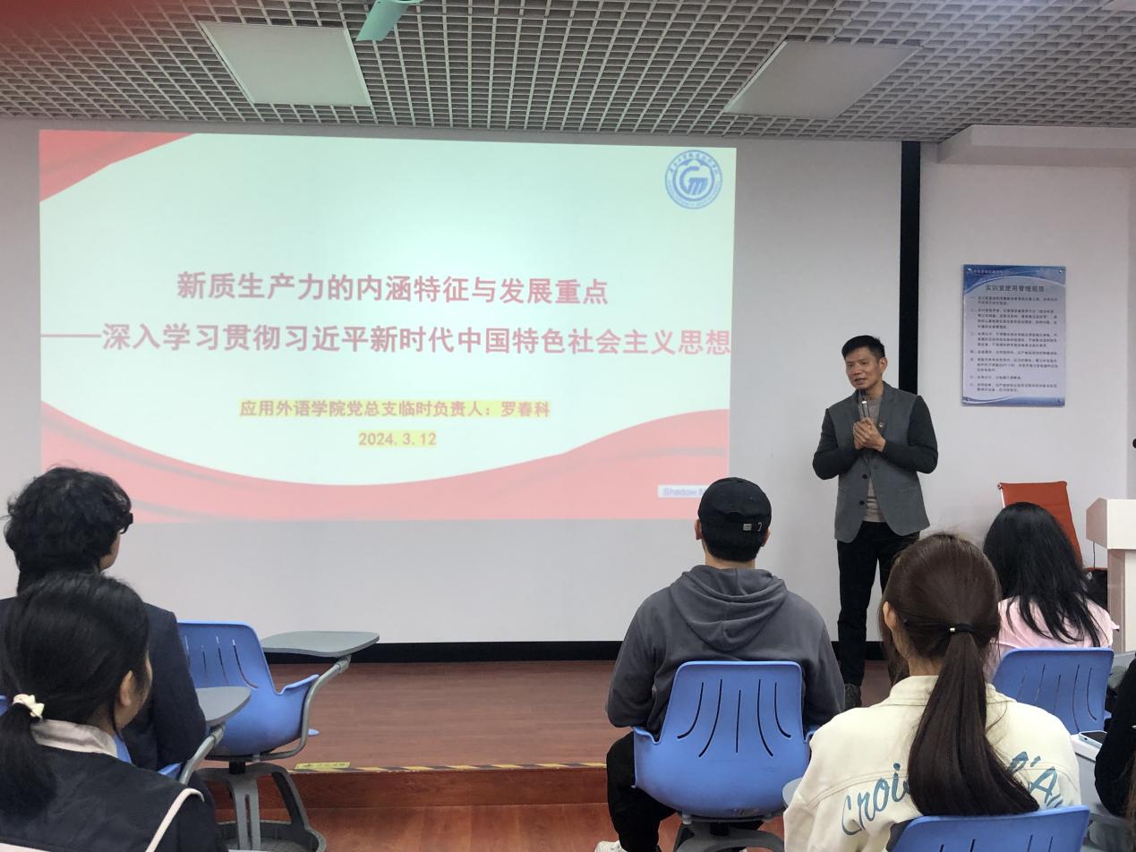 为深入学习贯彻习近平新时代中国特色社会主义思想,了解新质生产力的内涵特征与发展重点,提高应用外语学院学子对国家发展道路的认知,培养出基层高素质人才。3月12日,学院党总支临时负责人罗春科在白云校区实训楼602讲授“书记第一课”。学院入党积极分子到场参加此次讲座。