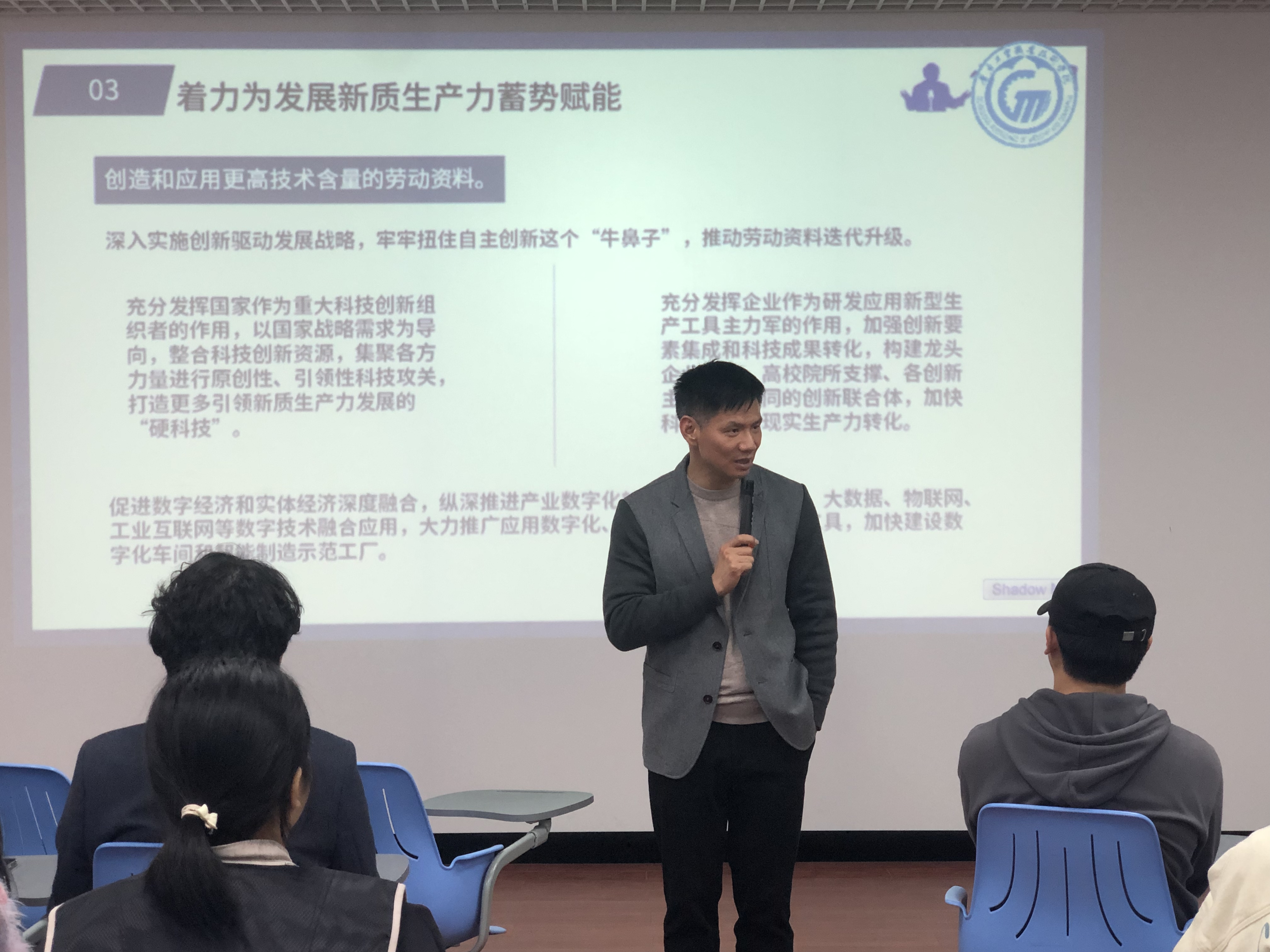 罗春科围绕新质生产力的基本内涵、新质生产力的主要特征、为发展新质生产力蓄势赋能三个方面深入浅出的带领同学们学习新质生产力的相关理论。他强调,要学深悟透习近平总书记重要指示精神,要结合国家和社会形势准确把握新质生产力的内涵,新质生产力的核心要素和如何开辟新质生产力。罗春科指出,更广范围的劳动对象是新质生产力的物质基础,社会对基层高素质人才需求强烈,更高技术含量的劳动资料是新质生产力的动力源泉,外语口语对于外院学子的重要性不言而喻。同时,罗春科采用案例教学法和现场师生互动,建议同学们结合自身专业对个人发展进行认真思考,精准谋划,着眼于当下,着眼于自我,并组合利用相关的生产要素,高效学习。