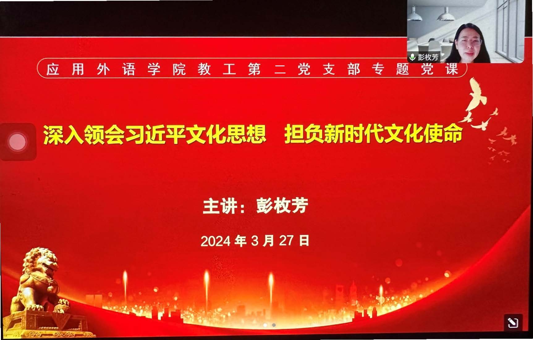 为了加强教师党员的使命担当,提升党员教师队伍的党性修养,327日,应用外语学院教工第二党支部举办了一场别开生面的线上专题党课。此次党课主题为“深入领会习近平文化思想,担负新时代文化使命”,旨在通过学习中华优秀传统文化,提升教工党员的文化素养,增强文化自信,推动学院文化建设。本次党课由应用外语学院院长彭枚芳主讲。