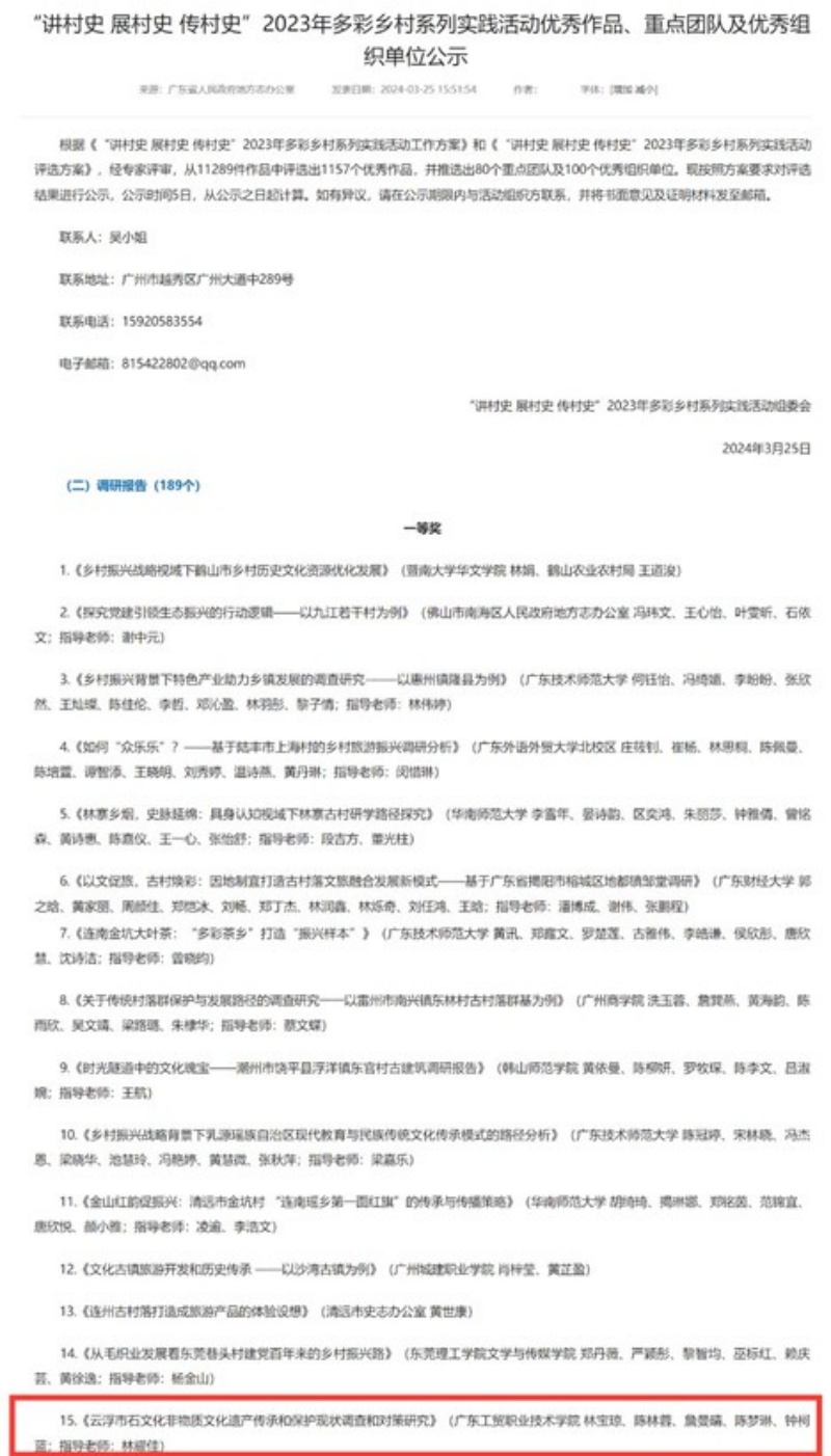 近日,“讲村史 展村史 传村史”2023年多彩乡村系列实践活动公布评选结果,我校师生团队调研报告《云浮市石文化非物质文化遗产传承和保护现状调查和对策研究》(100%精准出码规律资料网站 林宝琼、陈林蓉、詹曼晴、陈梦琳、钟柯蓝;指导老师:林耀佳)获一等奖(全省15个项目,高职唯一),助力学校获省评优秀组织奖!