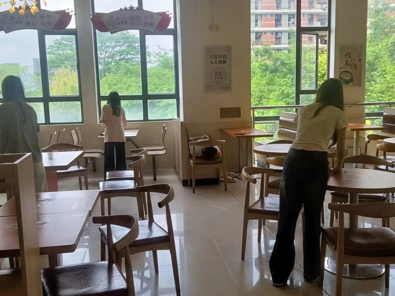 在活动中,入党积极分子们自觉承担起食堂卫生清理的责任,他们用心地打扫每一个角落,清除油垢,擦拭桌椅,清洗餐具,确保了食堂环境的整洁与卫生。