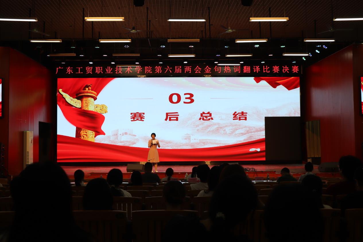 为深入学习宣传贯彻两会精神,筑牢理想信念之基,提升全校学子英语水平、扩展视野,6月13日下午,应用外语学院在白云校区2区演艺厅举办第六届两会金句热词翻译比赛决赛。学院党总支临时负责人罗春科,英语系专业带头人陈锦英、苏俊懿及辅导员出席本次比赛并担任评委。本次比赛由学生主持人侯广锭和何瑶主持。