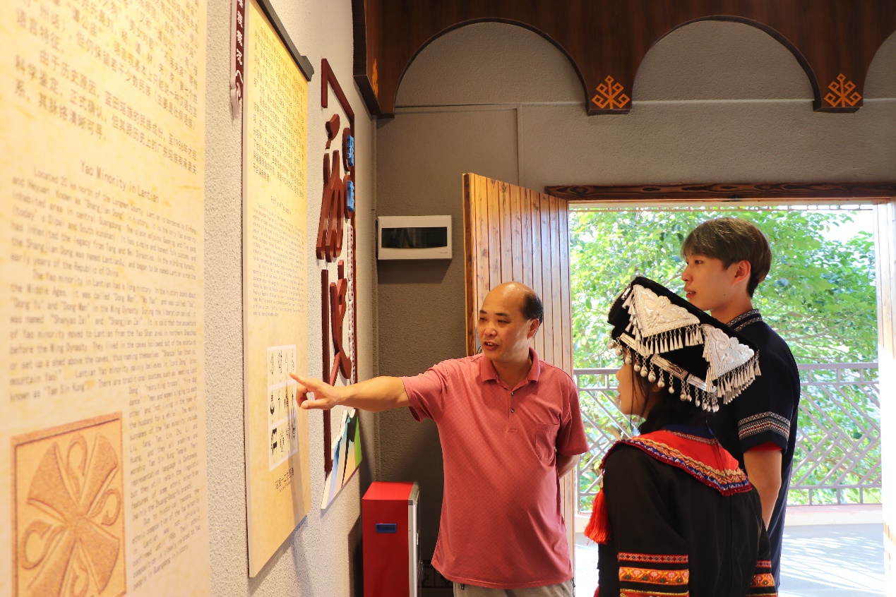 随后,林耀佳和姜旭扬带队“青翼”服务队四名出镜队员、四名摄影队员及一名调研队员出发前往小洞村昆虫展馆、蓝田瑶族文化展览馆以及瑶族风情园进行短视频素材拍摄。此过程中,队员们深入学习当地民族风俗特色,点燃了宣传蓝田瑶族乡的激情。