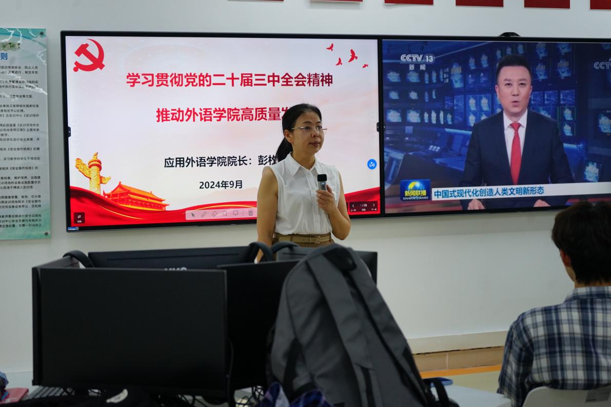 为学习贯彻党的二十届三中全会精神,推动外语学院高质量发展, 2024年9月19日,应用外语学院院长彭枚芳在行知楼609面向2024级新生上了院长思政第一课。