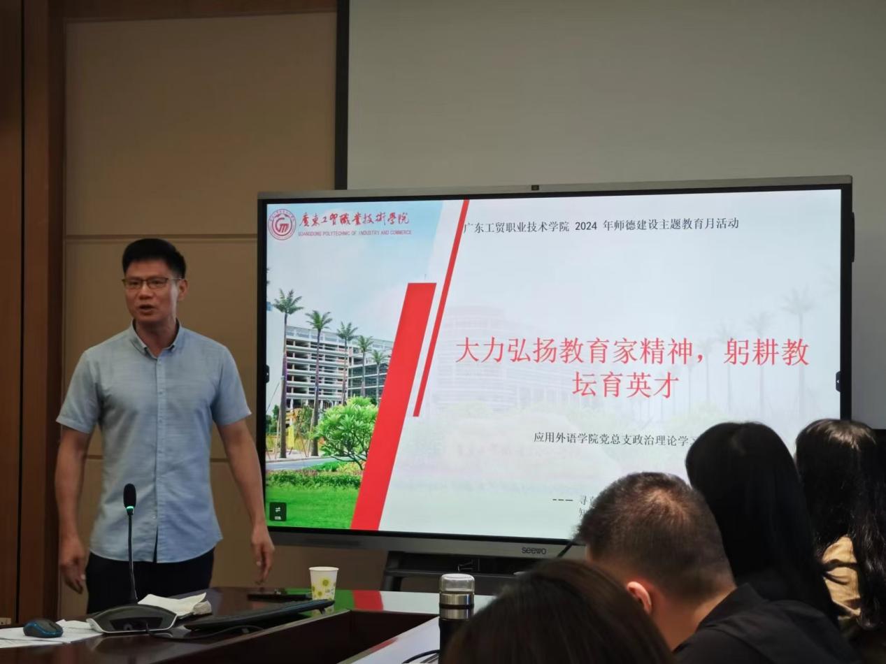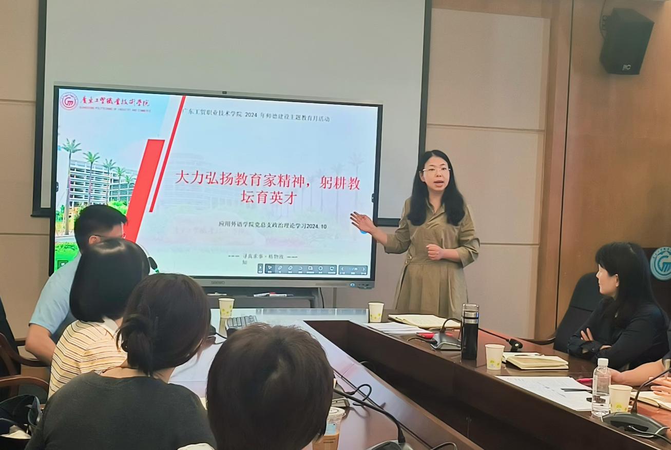 为进一步弘扬教育家精神,加强师德师风建设,进一步激励学院教师不忘立德树人初心、担当育人育才使命,营造尊师重教良好风尚,形成推动教育高质量发展的强大合力,20241012日,应用外语学院党总支在明德楼1-201召开政治理论学习会,学院党政班子成员、师生党支部书记、系主任、专业带头人和全体辅导员等人参加了会议。会议由学院党总支临时负责人罗春科主持。