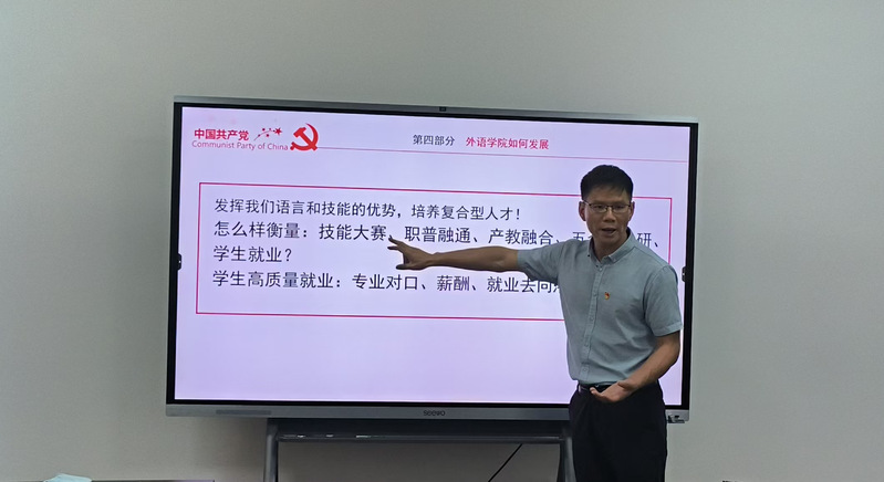 为深入学习贯彻党的二十届三中全会精神,助力实施科教兴国战略、人才强国战略,推动应用外语学院高质量发展,培育出新时代外语专业人才。11月11日,应用外语学院党总支书记罗春科在博学楼610,以“学习贯彻党的二十届三中全会精神,推动外语学院高质量发展”为主题,为外语学院党政班子成员、师生党支部书记和专业带头人带来了精彩生动的党课。