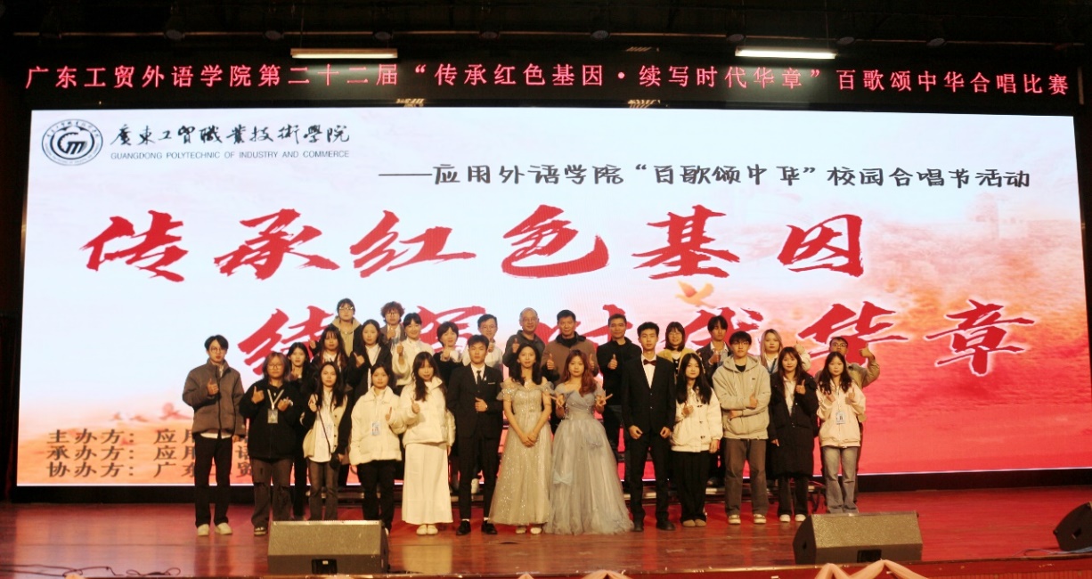 为热烈庆祝中华人民共和国成立75周年,全面贯彻习近平新时代中国特色社会主义思想,深入贯彻党的二十届三中全会精神,汇聚自信自强、团结奋进的强大正能量以及提升学生荣校爱校的意识,激发爱国情怀,弘扬报国之志,引导广大青年大学生深刻感悟习近平总书记的殷殷嘱托,践行“请党放心,强国有我”的铮铮誓言,增强“四个意识”、 坚定“四个自信”、做到“两个维护”,应用外语学院以“传承红色基因,续写时代华章”为主题,于2024年12月19日在白云校区演艺厅顺利组织开展第二十二届“百歌颂中华”校园合唱节活动院级比赛。