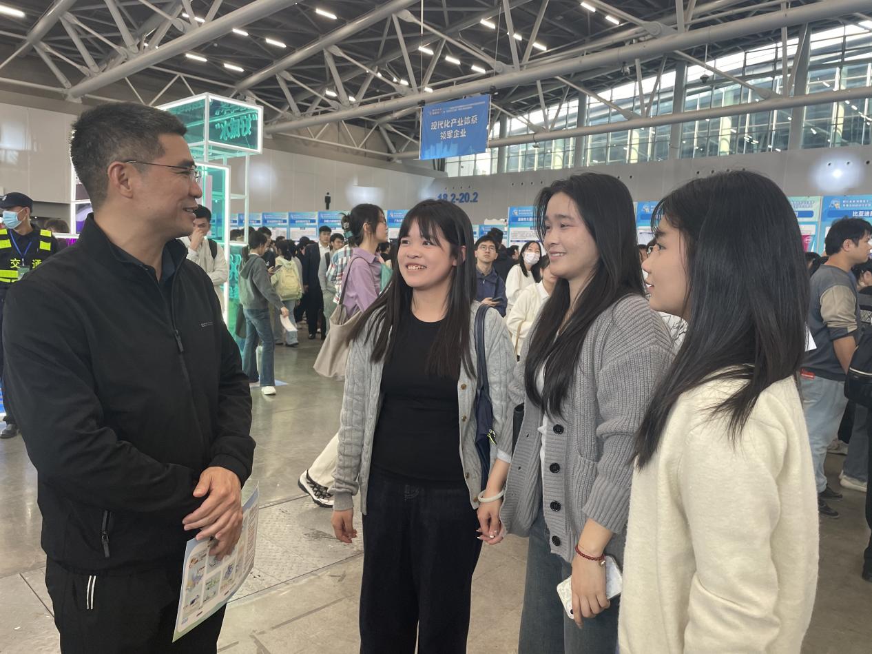 招聘会现场人头攒动,气氛热烈非凡。同学们怀揣着对未来的憧憬与期待,在各个企业展位间穿梭,积极主动地与企业招聘人员沟通交流,深入了解岗位需求,力求在众多机会中找到与自身专业和职业规划契合的岗位。学院党总支副书记郑楚生也来到招聘会现场,亲自走访了多家用人单位,详细了解招聘岗位的具体需求和用人标准;与学生们亲切交流,询问面试进展和求职感受,为学生答疑解惑,鼓励学生展示优势,把握就业机会。