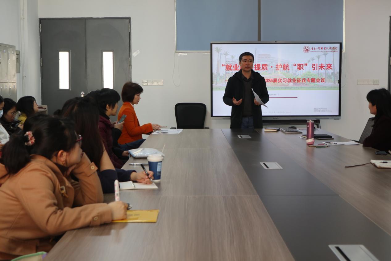 为全面落实教育部关于高校毕业生就业征兵工作部署,应用外语学院于4月1日下午在实训楼606会议室召开2025届毕业生就业征兵工作专题会议。学院党政班子、专业带头人、实习指导教师、毕业班班主任及辅导员等参与此次会议,共商就业征兵提质增效路径,为毕业生高质量就业筑牢根基。