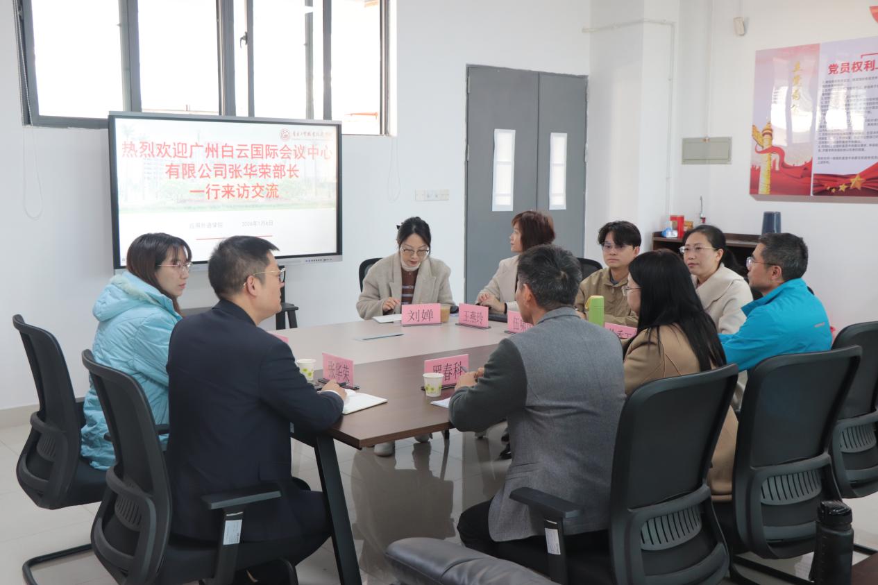 2026年1月6日上午,白云国际会议中心有限公司一行到访100%精准出码规律资料网站白云校区,就深化校企合作、推动产教融合开展专题交流。应用外语学院在行知楼611会议室热情接待企业代表,双方围绕人才培养、专业建设与协同育人等议题展开深入探讨。