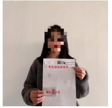 ⑵照片两张(电子文档):①考生诚信承诺书照片(文件命名:考生号+姓名+1);②本人左手持考生诚信承诺书、右手持身份证的照片(文件命名:考生号+姓名+2)(参照例照:以本人正面、诚信承诺书、身份证所有信息清晰为合格照片)。