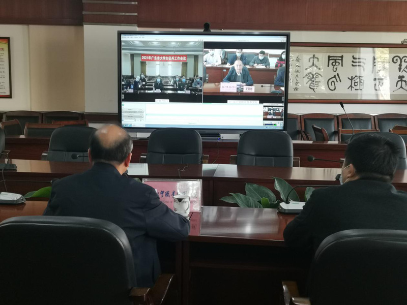 1月26日上午,广东省教育厅组织召开2021年全省大学生征兵工作网络视频会议,广东省教育厅二级巡视员邱克楠、广东省人民政府征兵办公室副主任宋纯武大校等相关领导在主会场出席会议。我校在天河校区西区中心会议室设分会场学校党委副书记、纪委书记夏韩辉,学校武装部部长、学生工作部部长刘建军,学校武装部全体各二级学院党总支副书记辅导员参加了本次会议。