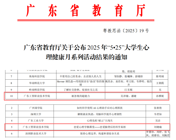近日,广东省教育厅发文对“5.25”大学生心理健康月系列活动进行表彰,我校在本次比赛中,共有两个作品获奖。