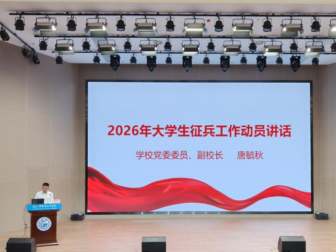 随后,学校组织召开2026年大学生征兵工作动员大会,唐毓秋在会上作动员讲话。他全面总结了我校2025年征兵工作成效,特别是“1234”征兵工作体系的创新实践,并从提高政治站位、创新动员方式、完善服务保障、激励参军报国四个方面,对新一年征兵工作提出明确要求。他号召全校师生积极行动,加强国防知识学习,增强国家安全意识,激励更多有志青年踊跃应征入伍,为国防和军队现代化建设贡献智慧与力量。