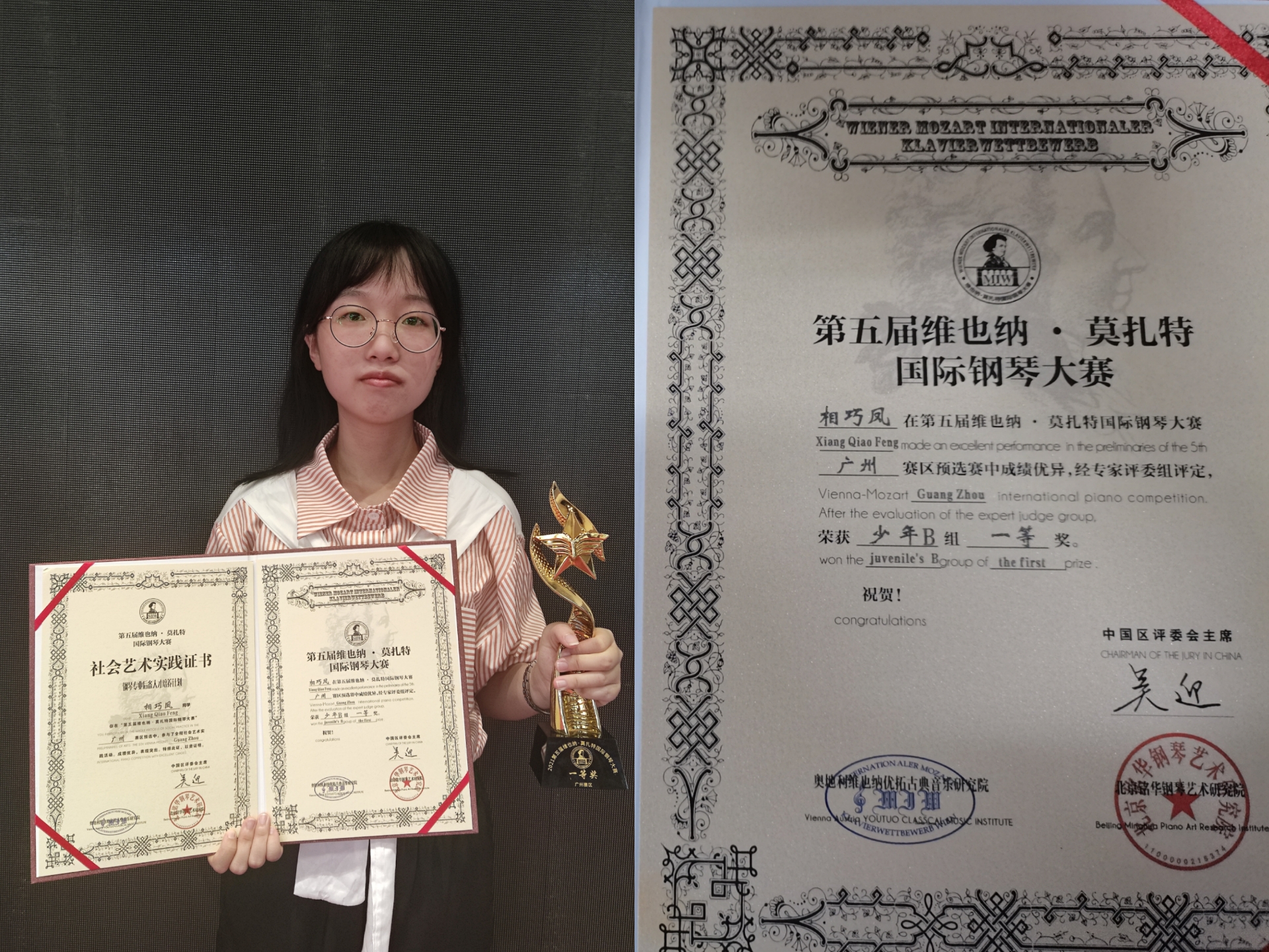 2020级学生获得第五届维也纳•莫扎特国际钢琴大赛一等奖二名、二等奖6名、三等奖60名,我校荣获优秀组织奖。
