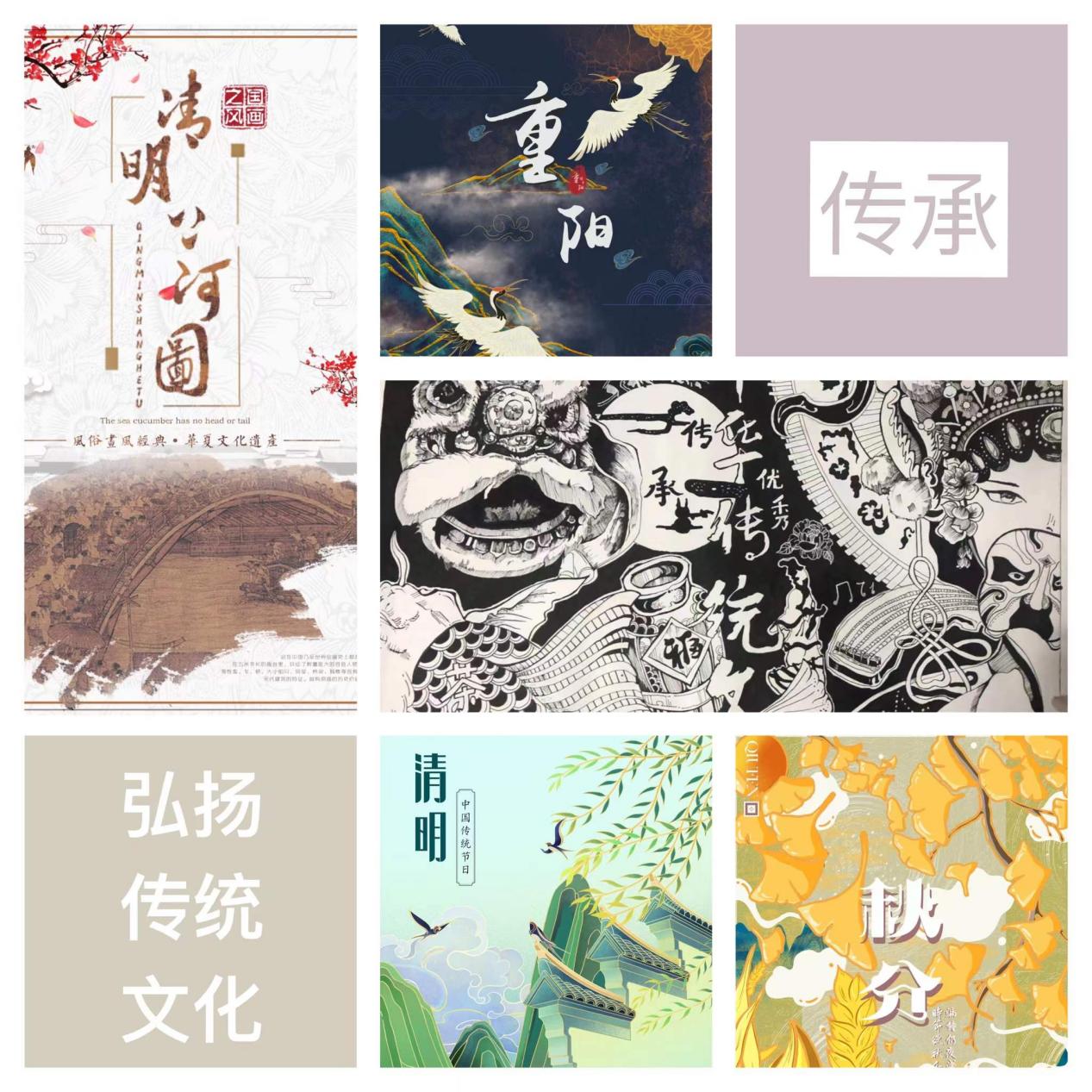 大力弘扬中华优秀传统文化推动传统文化创新性发展,与人们精神文化需求相契合,有效吸引感染学生,增强学生的参与感、认同感、获得感,营造有利于传承弘扬中华优秀传统文化的良好校园氛围。特此,面向广大在校工贸学子,开展以“传承与弘扬中华优秀传统文化”为主题的广告设计征集活动11月底,艺教学院开始了广泛的宣传,发布比赛海报到各个班群,充分调动学生的积极性同时,欧梓楠老师和隋嫦婉老师还利用课余时间深入到学生中宣传传统文化知识以及讲解海报设计的表现手法和形式。经过近半个月的时间,收集到的学生作品有100多张,主要为艺教学院的学生,同时还有其他校区的同学通过不同方式转交过来的部分作品。通过比赛,让同学们在潜移默化中受到中华优秀传统文化的熏陶推动传统文化在新一代年轻人中能更好地发展和传承。经过老师们的认真评选,20视传2班梁殷铭、20视传3班郑新强、21视传2班汤婉珊、20视传2班林荣庭四名同学获得校级一等奖,20视传1班黄明祥、20视传1班丁华圳、20视传2班彭茂青、20视传3班许洪铭、21学前1班郑佳彤、20数艺2班蔡荣杰等六名同学获得二等奖,21视传1班曹晓丹、20视传1班陈思宇、20视传1班简心怡等十名同学获得三等奖。