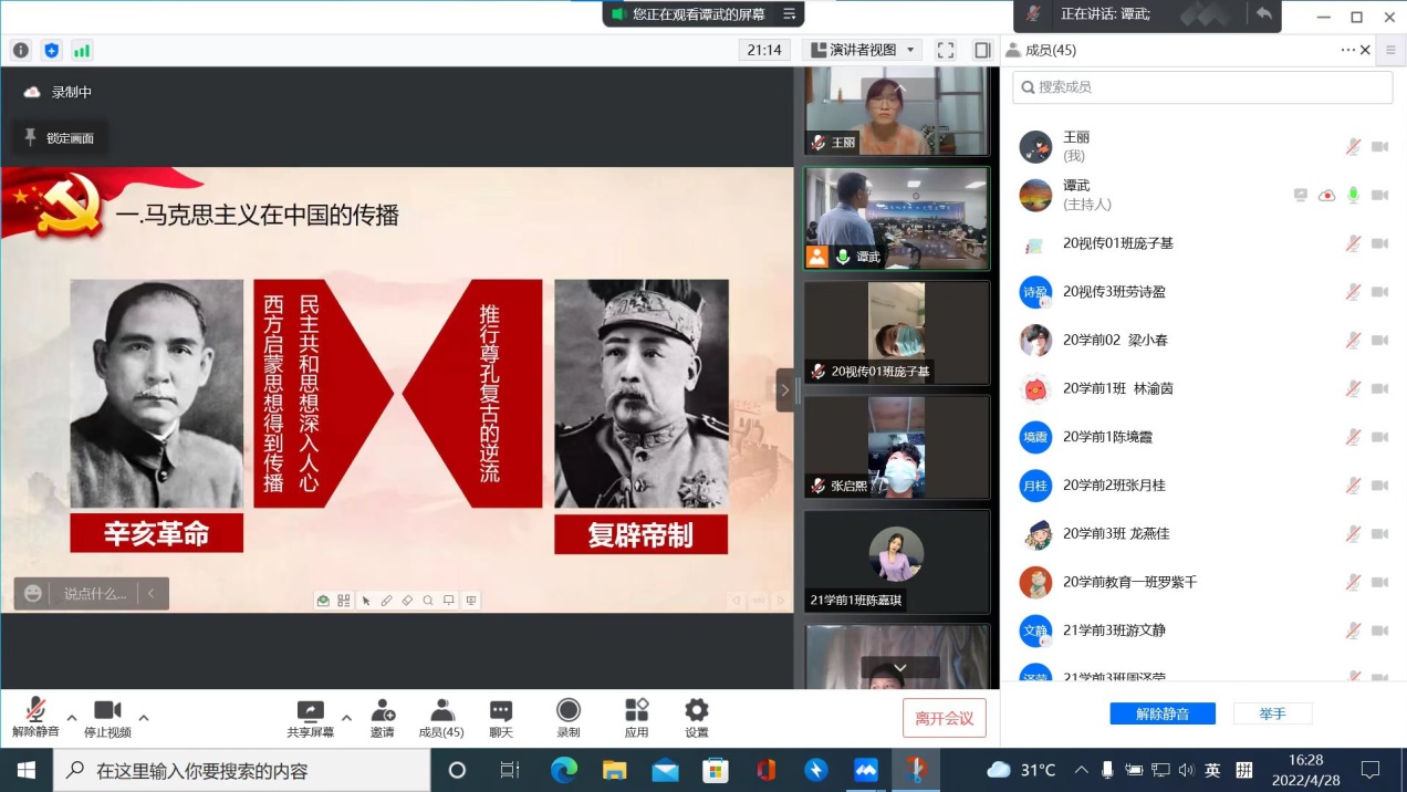 2022年4月28日下午,艺术与教育学院学生党支部开展了专题党课学习,党课由学生党支部书记谭武同志主讲,采用线上+线下的方式进行,学院党总支副书记叶宜同同志与学生党支部全体党员、发展对象以及入党积极分子一起,共79人参加了党课学习。
