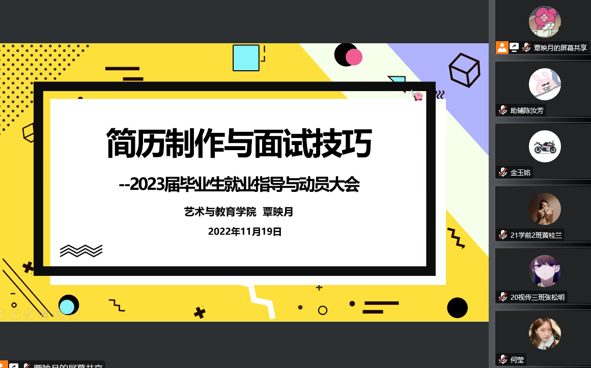 为提升2023届毕业生求职技能,助力就业,提高就业质量,艺术与教育学院于2022年11月19日下午三点举行了线上就业指导讲座,参会人员为全体毕业生,由辅导员覃映月老师主讲。
