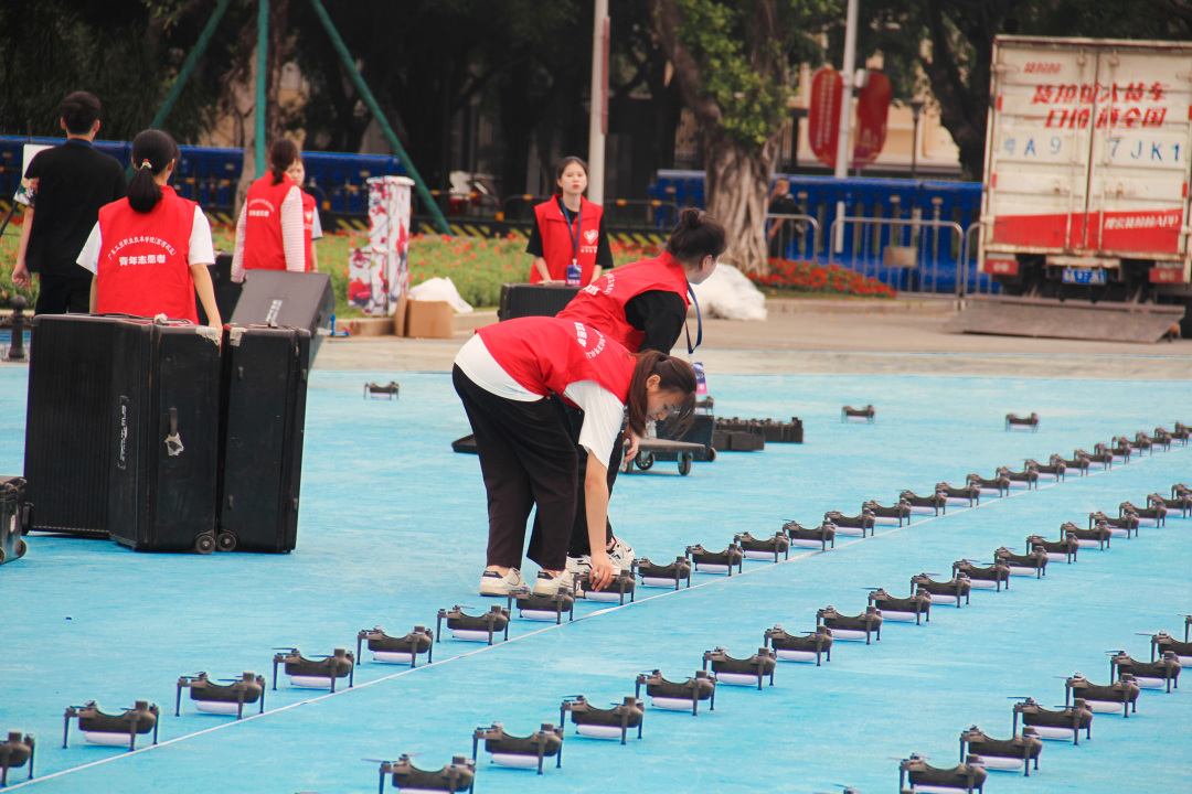 在舞台后场的志愿者们协助无人机表演团队,仔细摆放好每一架无人机,迅速地安装好一千台无人机的电池,使得无人机表演秀顺利进行。