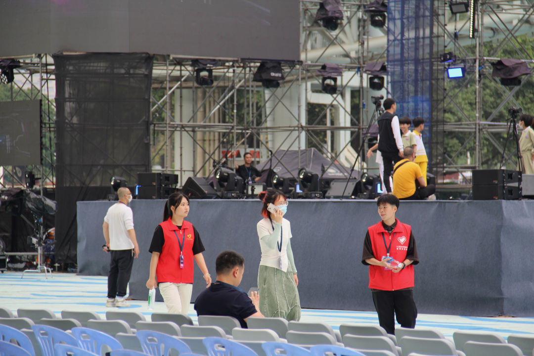 在台前幕后,志愿者们协助工作人员调整音响及话筒,保证了音乐会的舞台能够呈现出完美的效果