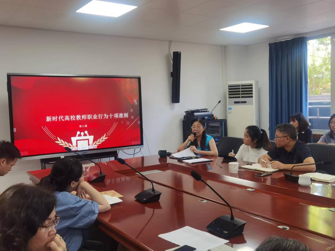 会议第一阶段由李小燕副院长开展师德师风教育集中学习,领学《新时代高校教师职业行为十项准则》,引导广大教师努力成为有理想信念、有道德情操、有扎实学识、有仁爱之心的好老师,着力培养德智体美劳全面发展的社会主义建设者和接班人。李小燕特别指出,老师们要成为学习型好老师,并分享了如何做一名学习型好老师。希望老师们可以努力提升自己,为学院贡献力量,实现自己的人生价值。