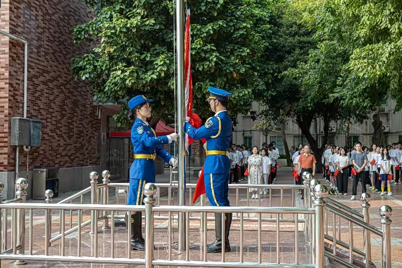 上午830分,升国旗仪式正式开始,国歌响起,全场师生向国旗致注目礼,高声齐唱《义勇军进行曲》。五星红旗冉冉升起,在阳光中迎风飘扬,全体师生面向国旗,表达对伟大祖国的深切祝福和崇高敬意。
