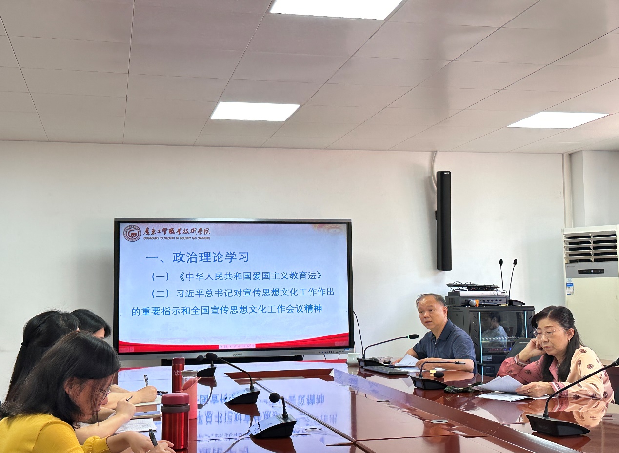 叶宜同首先传达了学校《关于组织开展政治理论学习的通知》精神,接着领学《中华人民共和国爱国主义教育法》。爱国主义教育法共五章四十条,规定了爱国主义教育的主要内容,涵盖思想政治、历史文化、国家象征标志、祖国壮美河山和历史文化遗产、宪法和法律、国家统一和民族团结、国家安全和国防、英烈和模范人物事迹等方面。最后,叶宜同传达了习近平总书记对宣传思想文化工作作出的重要指示和全国宣传思想文化工作会议精神,并对广东省委常委会对深入学习贯彻习近平文化思想所提出的四个要点进行了详尽学习。学习会后,专任教师陈维璐表示,我们校区所处荔湾区,是广州的老城区,有许多的中华优秀传统非遗文化,它们博大精深、开放包容,是祖先留给我们的宝贵遗产。我们是艺术与教育学院,可以坚持守正创新相结合,积极利用自己的专业特点推动非遗文化创造性转化、创新性发展。 辅导员莫华成表示,作为一名辅导员,自己将贯彻落实好习近平总书记重要指示精神,创新工作方式方法、推动社会主义核心价值观广泛培育、深度传播、扎实践行,让爱党、爱国、爱社会主义时代强音持续奏响。