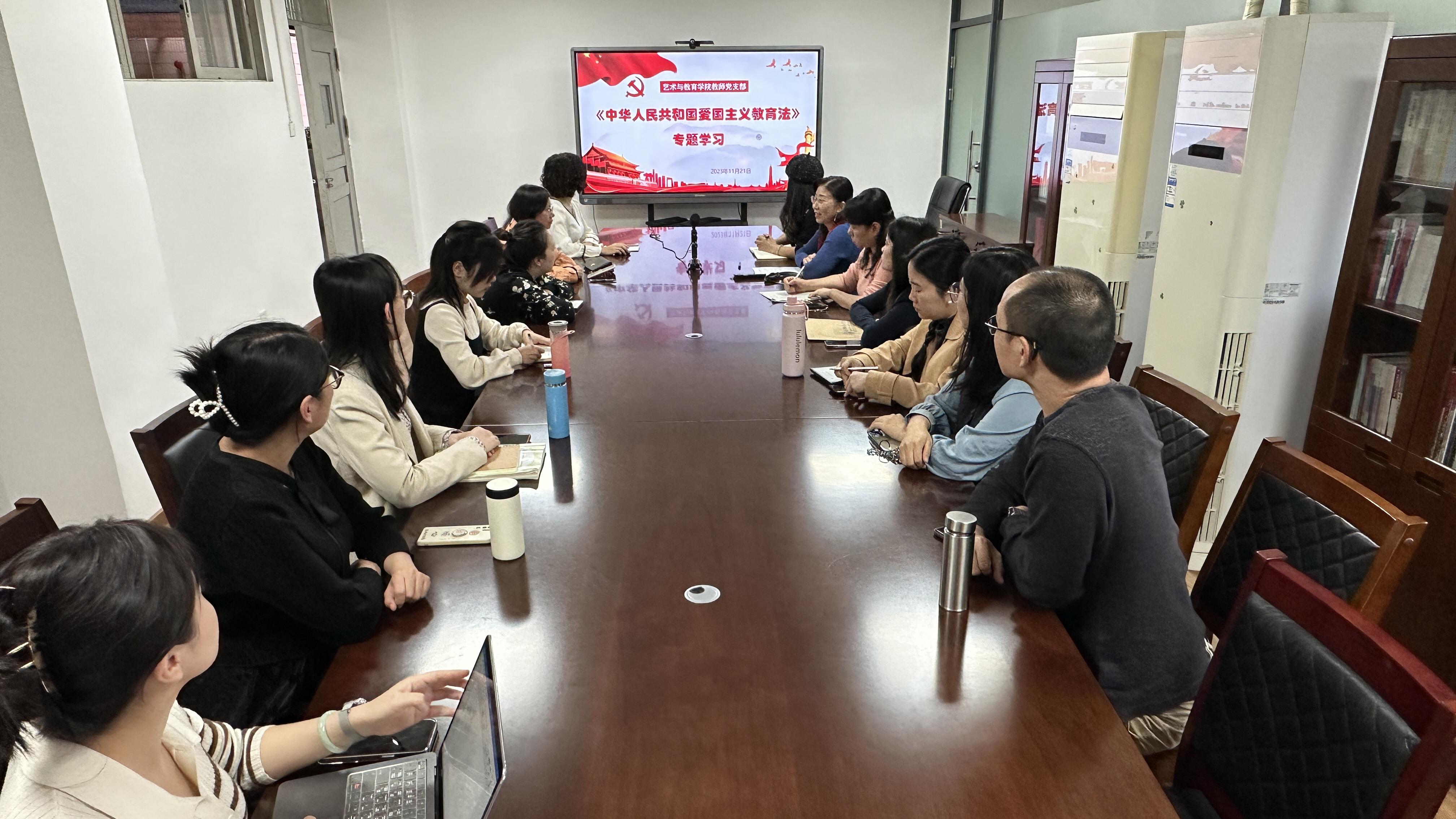 11月21日下午,艺术与教育学院教师党支部在笃学楼208会议室深入开展《中华人民共和国爱国主义教育法》专题学习。会议由教师党支部书记区翠梅主持。