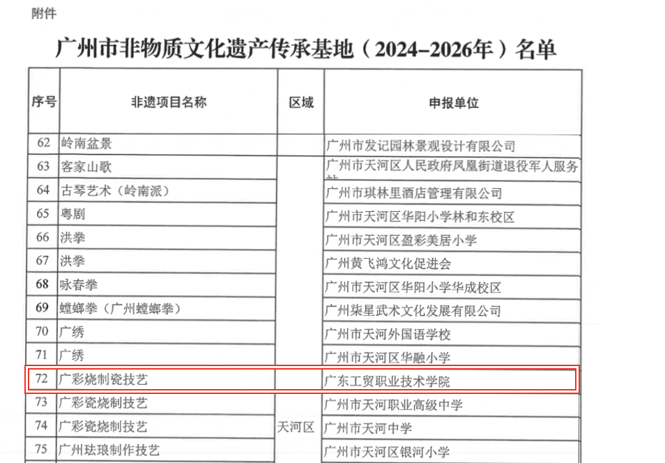 为加强广州市非物质文化遗产保护工作传承载体的建设,拓展社会各界参与非物质文化遗产保护的渠道,市文化广电旅游局开展了市非物质文化遗产保护传承基地(2024-2026年)申报工作。经各区各市级非遗项目保护单位的推荐申报,专家评审委员会审议,近日,广州市文化广电旅游局公布入选广州市非物质文化遗产传承基地(2024-2026年)名单,我校“广彩烧制瓷技艺”项目首次入选,成为广州市非物质文化遗产传承基地(2024-2026年)。
