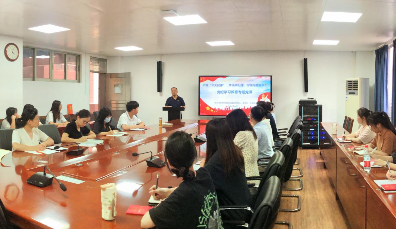 然后,艺术与教育学院党总支临时负责人叶宜同讲授了以“严守‘六大纪律’,争当讲纪律、守规矩的表率”为主题的党纪专题党课。党课内容围绕“学纪、知纪、明纪、守纪”四个方面学习展开。叶宜同提到,希望通过这次党课,能够进一步增强大家的党纪意识,提高大家的党性修养,为推动党和人民事业发展提供坚强的纪律保障。
