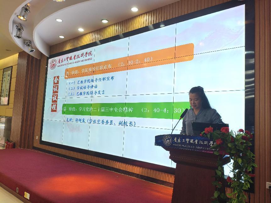 10月24日下午,艺术与教育学院在笃学楼报告厅召开全体教职工大会,会议由保卫部部长、艺教学院党总支副书记叶宜同主持,学校党委委员、副校长孙师家、艺教学院院长张幼晖及全体教职工参加了会议。本次会议分为两个阶段,第一阶段是对学院领导进行任职宣布;第二阶段是孙师家领学党的二十届三中全会精神。