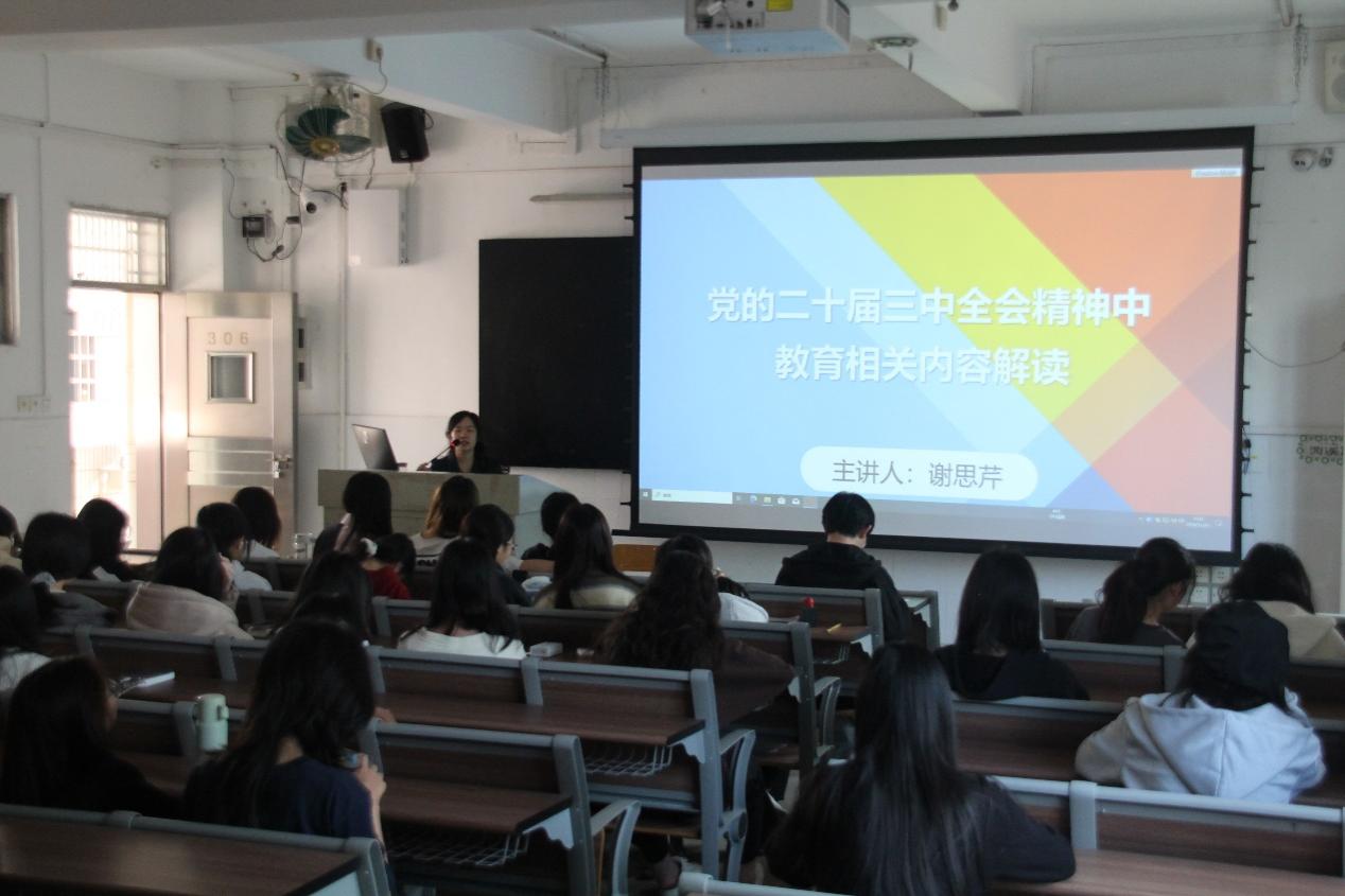 为深入学习贯彻党的二十届三中全会精神,20241121日,学校“六队百人”宣讲团成员谢思芹面向学前教育专业学生举办了一场主题为“党的二十届三中全会精神中教育相关内容解读”的宣讲活动,学前教育专业50多名同学参加了活动。