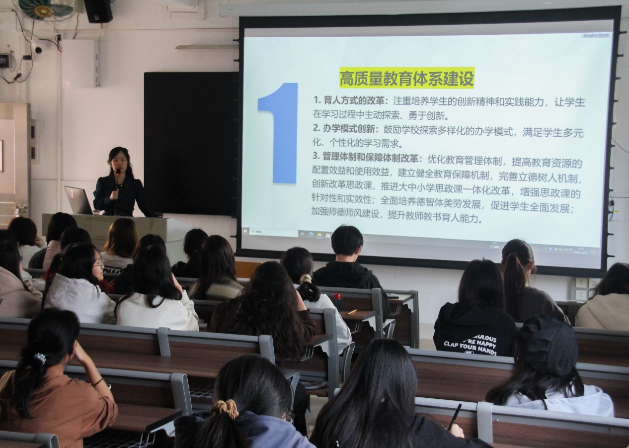 宣讲会上,谢思芹从高质量教育体系建设等八个方面梳理了全会中有关教育的内容,探讨了我国建设教育强国需要正确处理的重大关系,和在场同学展开了对于自身未来职业发展的讨论,同学们纷纷就“学前教育专业的我们,能够做什么?”这个主题表达了自己短期的努力方向和对未来的展望。