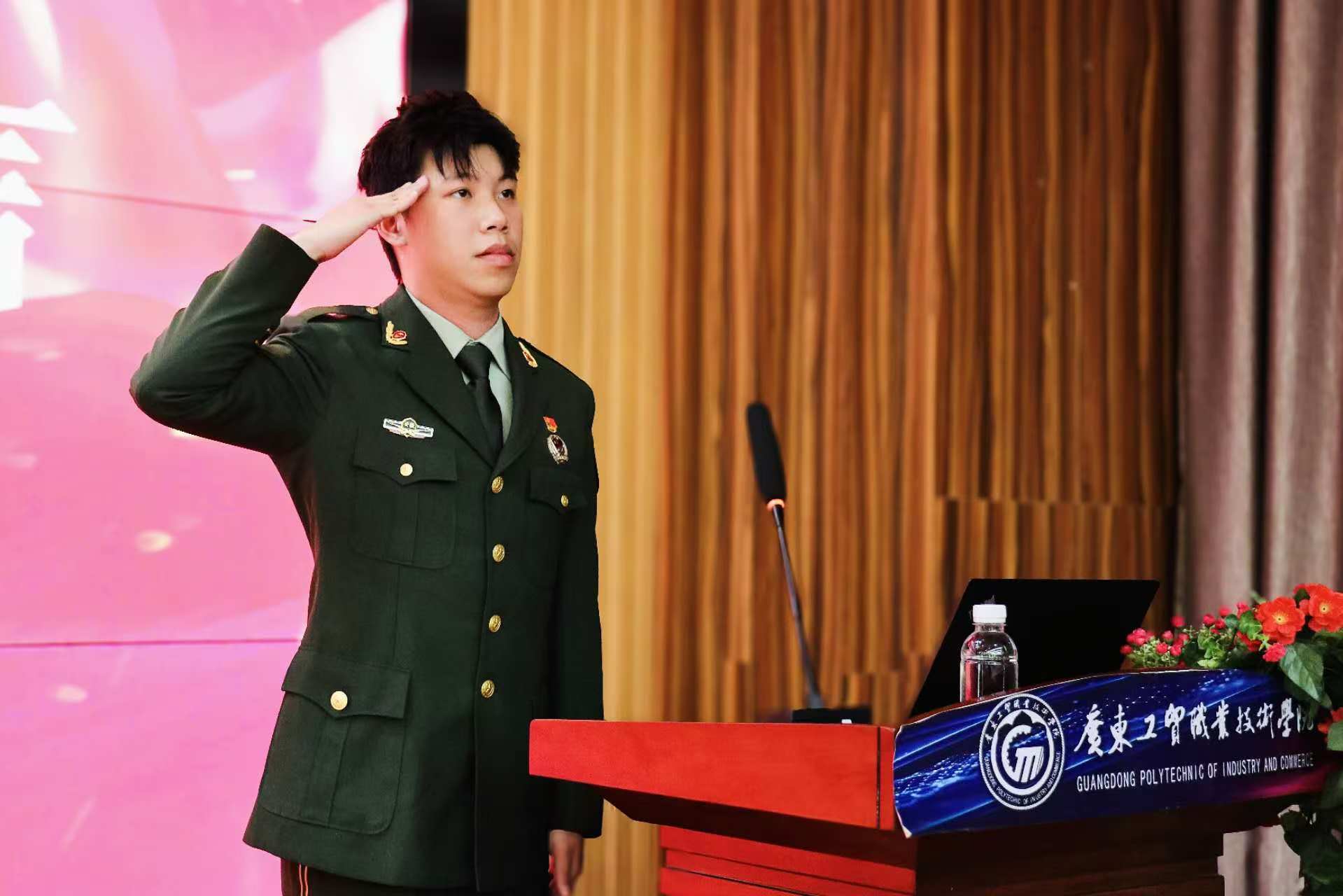 优秀退役大学生士兵代表冯加城同学分享了自己的军旅经历。他讲述了军队生活对自己身心的磨砺,强调军营中的自律、坚韧和责任感如何帮助自己在学业上更加专注,并鼓励同学们积极响应国家的号召,投身军营,体验不同的人生历程,积累宝贵的人生财富,未来无论走向何方,这段经历都将是难忘的财富。