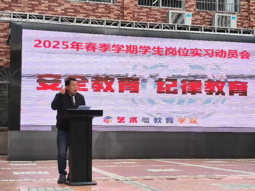 为落实学院教学部署,提高人才培养质量,帮助同学们树立正确的实习观念,明确实习要求,12月26日下午14点,艺术与教育学院在荔湾校区篮球场召开2022级学生岗位实习动员会。本次会议由艺术与教育学院学工办主任谭武主持,学院院长张幼晖、副院长彭金奇出席会议并发表讲话,2022级全体在校生以及岗位实习指导老师到场聆听。