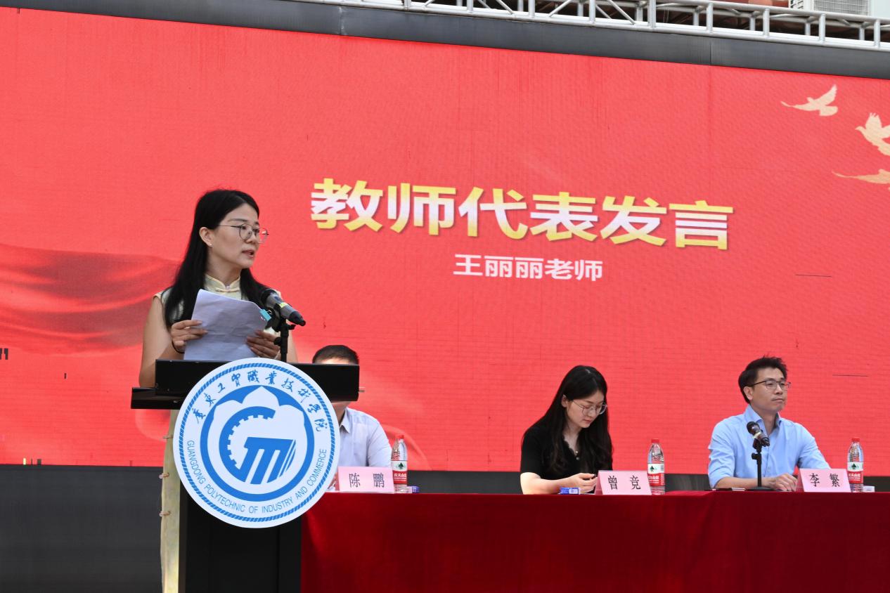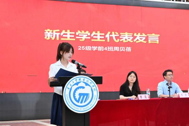 教师代表王丽丽以“成长合伙人”身份,为新生送上“三句箴言”:明大学之道——在跨校区合作项目中践行“学以致用”;练青春之技——通过各类证书、技能竞赛锤炼硬本领;涵生命之美——在乡村支教、社区服务中感悟教育温度。她结合所指导的学生团队斩获“挑战杯”省赛佳绩的案例,鼓励新生“在协作中突破,在创新中扎根”。