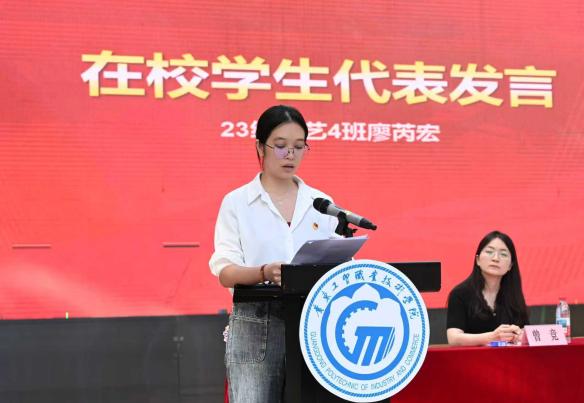 在校生代表、23级数艺4班廖芮宏以“探索心、共情心、扎根心”分享成长故事:“在非遗文创设计中,我们用数字技术让传统纹样‘活’起来;在乡村支教时,孩子的一句‘老师,这是太阳的颜色’,让我懂了美育的真谛。”