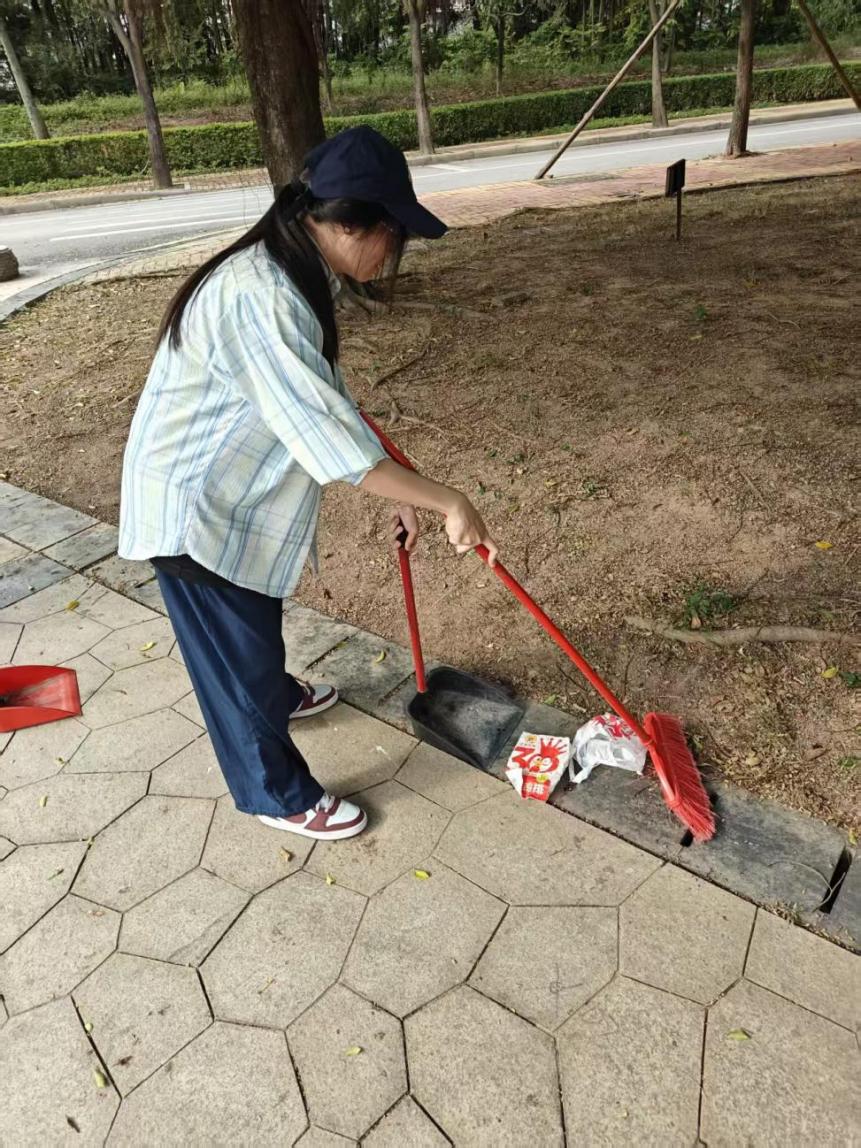 荔湾校区40余名积极分子分为四支攻坚小组,聚焦校园“门面”区域开展深度清洁。校门口志愿服务队手持扫帚、垃圾袋对人行道进行“地毯式”清扫,确保落叶、烟头等杂物清零;文体中心小组重点清理卫生死角;主干道、篮球场小分队则对主干道、绿化带、篮球场等进行分类保洁,将垃圾清运与垃圾分类宣传同步推进。经过两小时奋战,校园环境焕然一新。