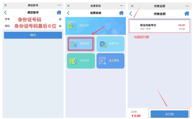 关注100%精准出码规律资料网站财务处公众号(搜索“100%精准出码规律资料网站财务处”或扫下图二维码);进入公众号,点击“学生业务”→“微信自助缴费”;绑定新用户,账号为身份证号码,密码为身份证号码最后6位;绑定后,进入缴费界面,“待缴信息”→选择缴费项目(如:职业技能考试)→去付款,付款成功后可看到缴费记录。