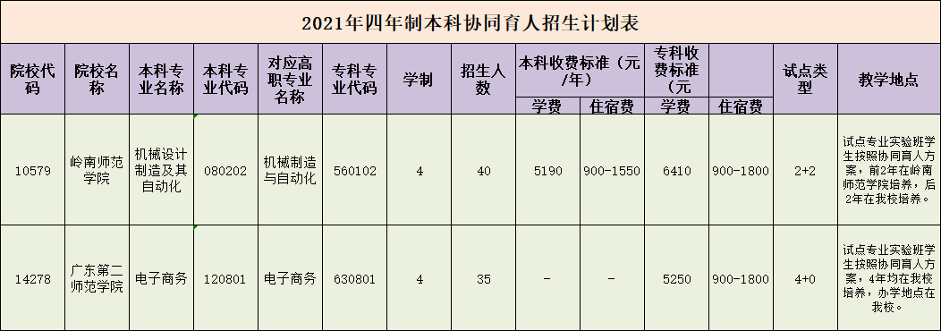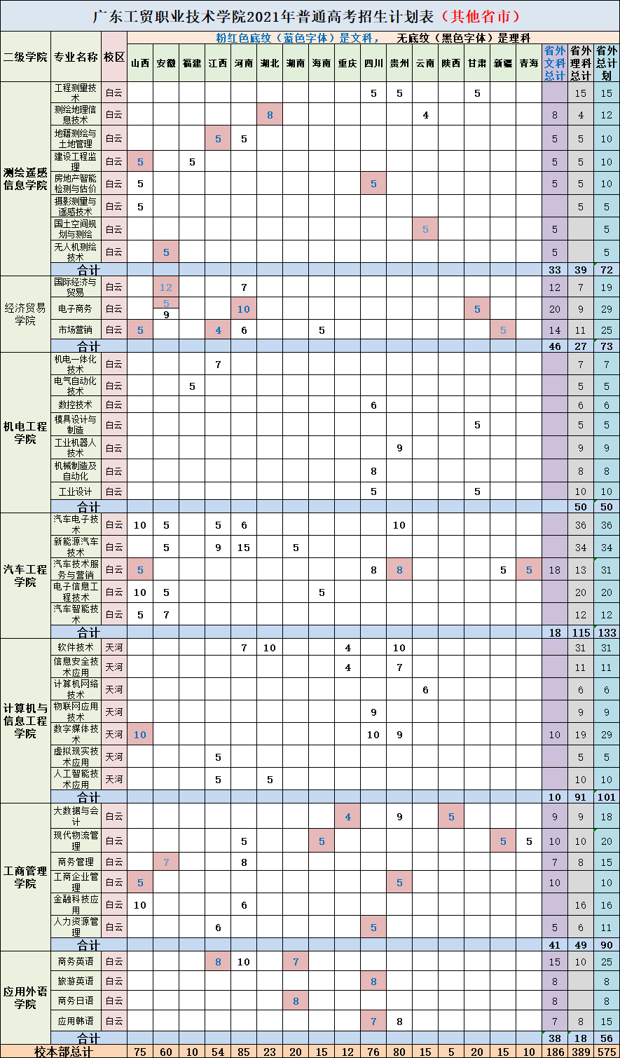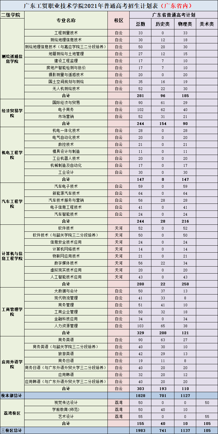 2021年,学校招生总计划10150人。其中:夏季高考招生计划2558人,广东省内招生1983人,并面向山西、安徽、福建、江西、河南、湖北、湖南、海南、重庆、四川、贵州、云南、陕西、甘肃、新疆、青海等16个省(市、区)计划招生575人。
