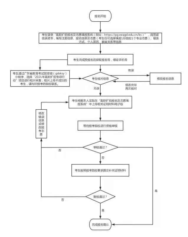 2021年9月22日14:00至9月27日14:00考生登录2021年广东省高职扩招报名及志愿填报系统(https://pg.eeagd.edu.cn/ks),根据系统指引阅签诚信承诺书,填写注册信息、报名信息及志愿信息、联系方式、个人简历、 家庭关系等信息,获取报名号、绑定手机号,通过微信小程序釆集相片并经核对信息无误后根据实际按照要求上传相关证明材料料电子版,相片上传不成功的考生,请与我校联系。逾期不再办理相关手续,考生不得再修改已填报个人信息及院校专业志愿。