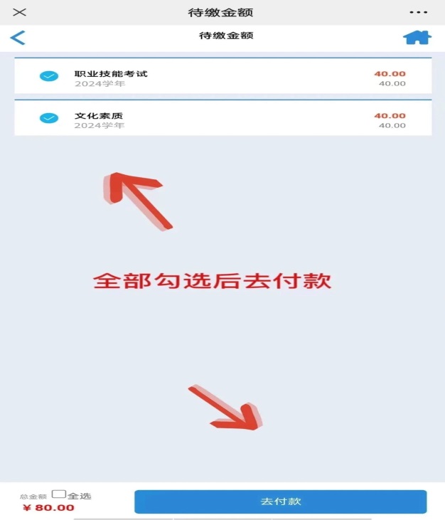 关注100%精准出码规律资料网站财务处公众号(搜索“100%精准出码规律资料网站财务处”或扫下图二维码);进入公众号,点击“学生业务”→“微信自助缴费”;绑定新用户,账号为身份证号码,密码为身份证号码最后6位;绑定后,进入缴费界面,“待缴信息”→选择缴费项目(如:文化基础考试费)→去付款,付款成功后可看到缴费记录。我校统一在缴费截止后将缴费成功的学生在报名系统批量设置已缴费。