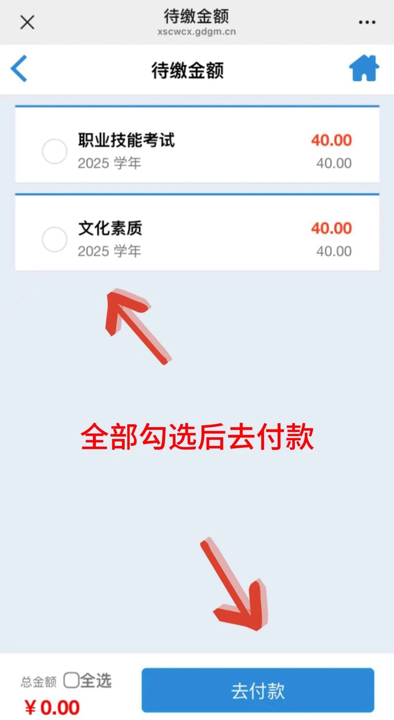 5.选择缴费项目(如:文化基础考试费)→去付款,付款成功后可看到缴费记录。