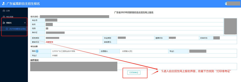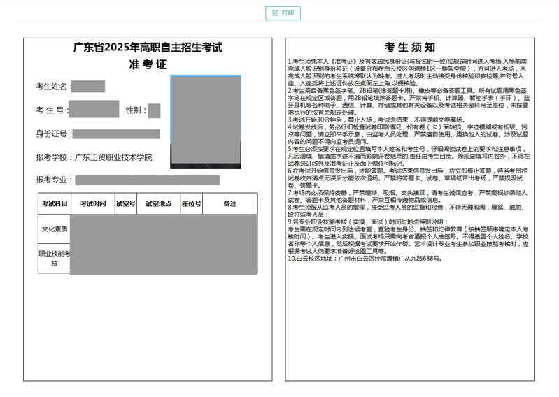 各位考生务必在2025年5月15-17日内凭高考报名号及密码自行登录“广东省2025年高职院校自主招生网上报名系统”(网址https://pg.eeagd.edu.cn/gzks/)打印准考证。