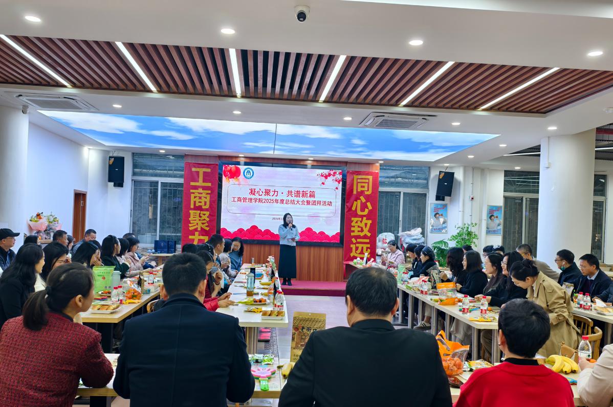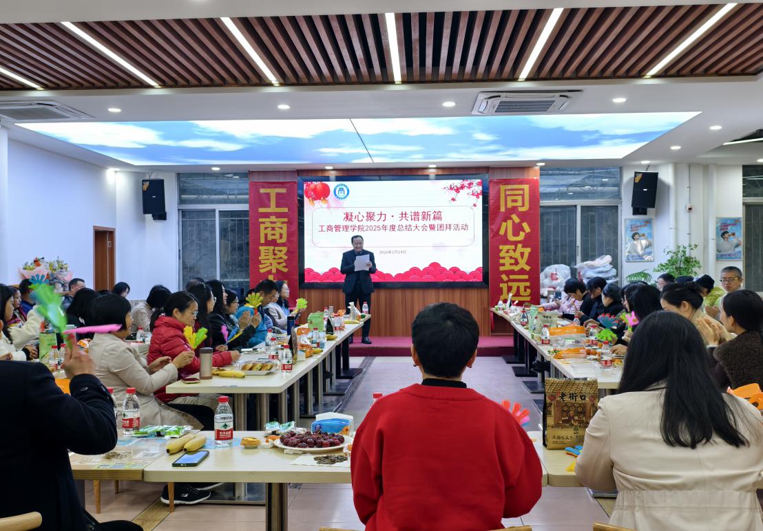 日月其迈,时盛岁新。为全面总结回顾2025年度工作,分享成果、凝聚共识、展望未来,同时喜迎新春佳节,2026年1月14日上午,工商管理学院在天河校区举办“凝心聚力·共谱新篇”2025年度总结大会暨团拜活动。学校党委委员、纪委书记陈斌应邀出席,学院全体教职工欢聚一堂,活动由学院党总支书记周清莲主持。