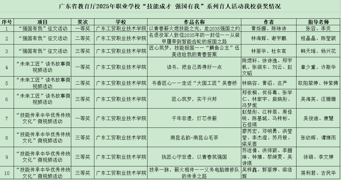 近日,广东省教育厅公布2025年职业院校“技能成才强国有我”系列育人活动评选结果,我校师生积极参与、稳步推进,斩获各类荣誉共14项。其中,一等奖3项、二等奖2项、三等奖5项,3位指导教师获评“优秀指导老师”;由于组织工作突出,成绩显著,学校获评“优秀组织奖”,这份成绩既是鼓励,也为后续育人工作指明了方向。